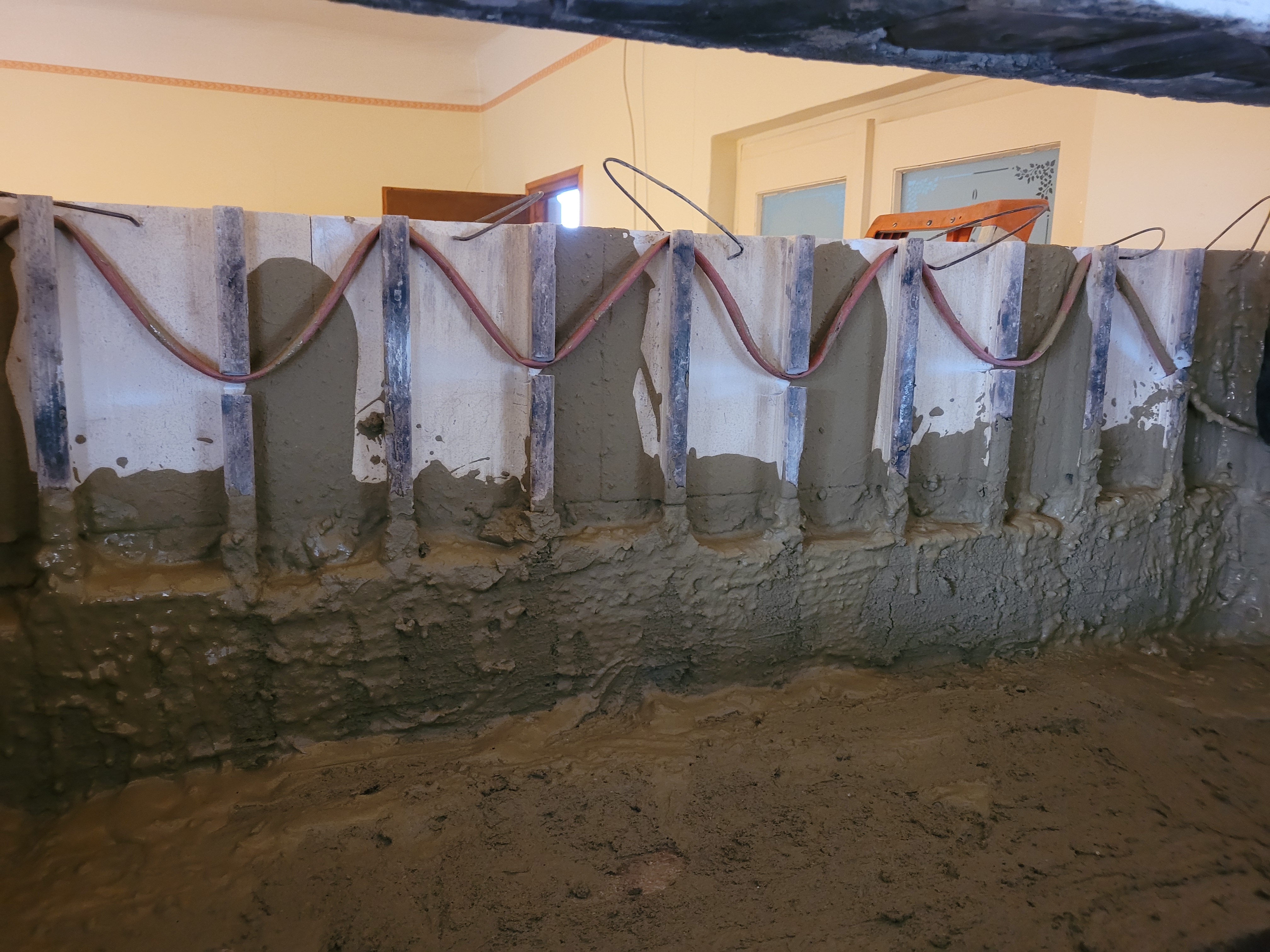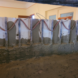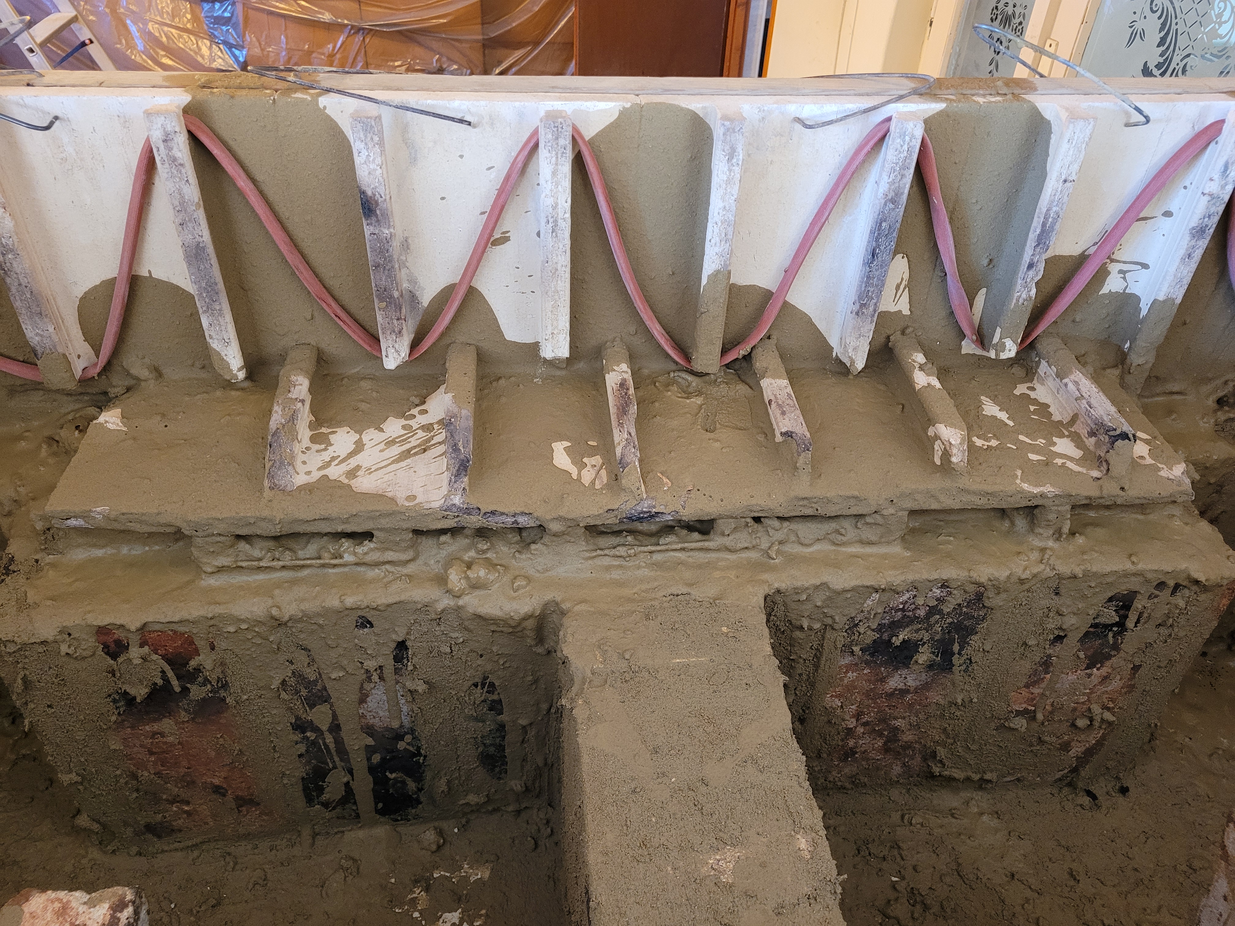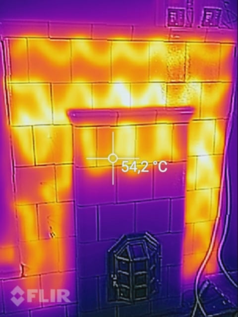A fűtőkábelek a belső falazatban futnak, miközben a tűztér és a füstjáratok szabadon maradnak a hagyományos tüzeléshez.